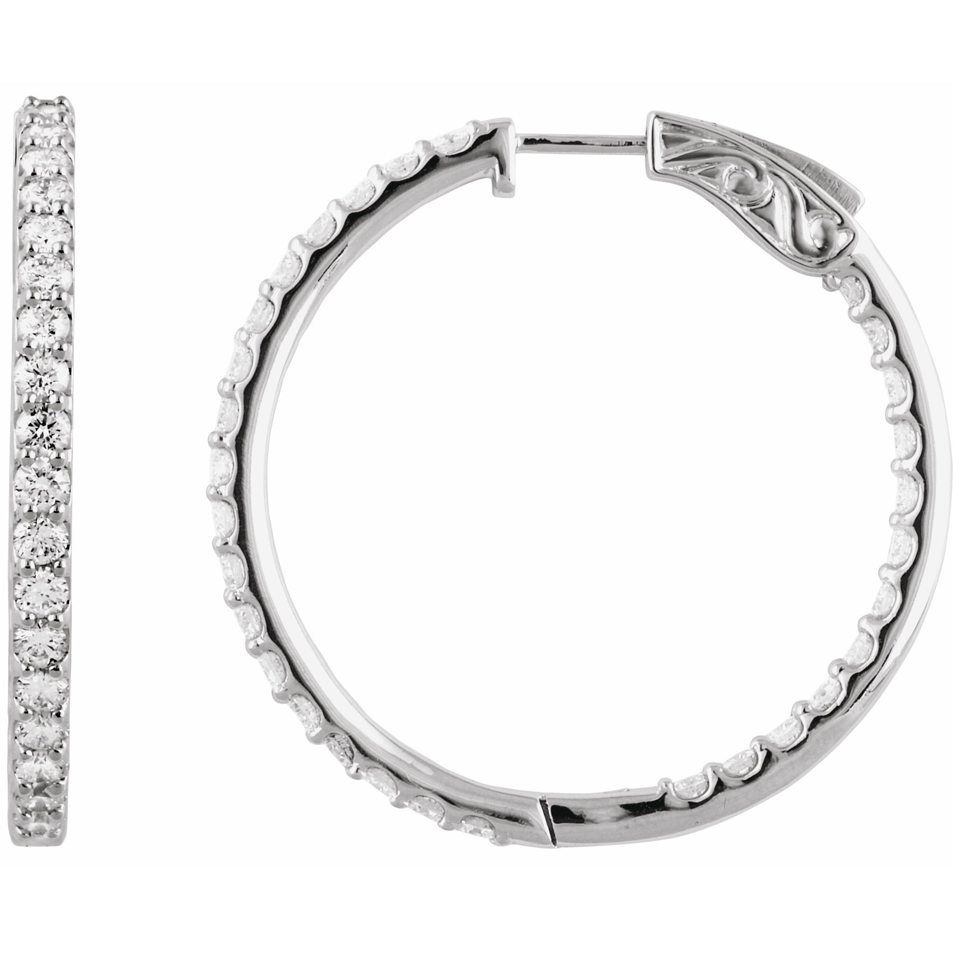 650183 / Set / Diamond / Pair / 34.5 Mm :: 3 Ctw / 14K White / I1, H+ / Polished / Inside-Outside Hinged Hoop Earrings