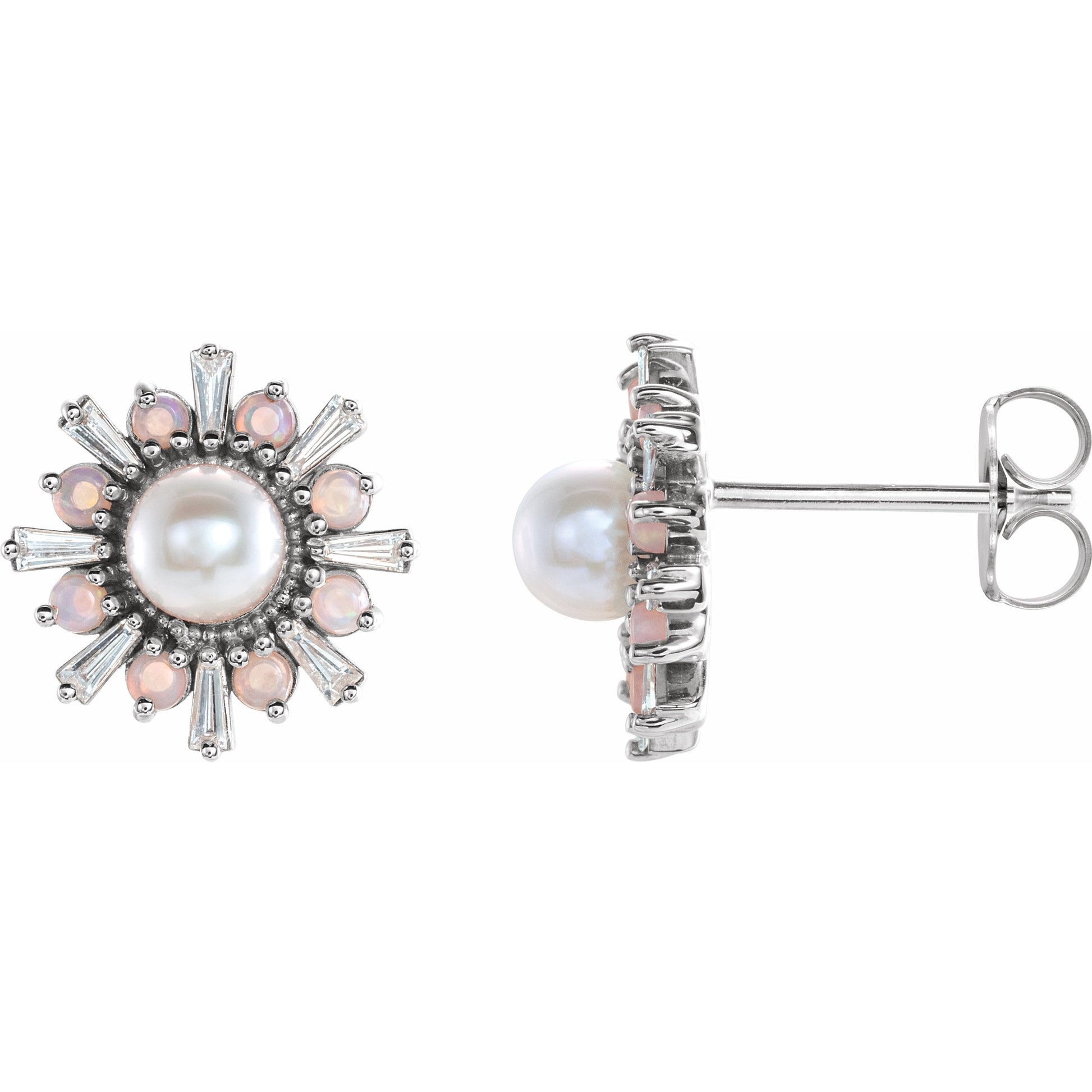 87076 / Set / 14K White / Earring / Friction Backs Included / Pair / Polished / Akoya Pearl, Genuine White Opal And 1/6 Ctw Diamond Earring