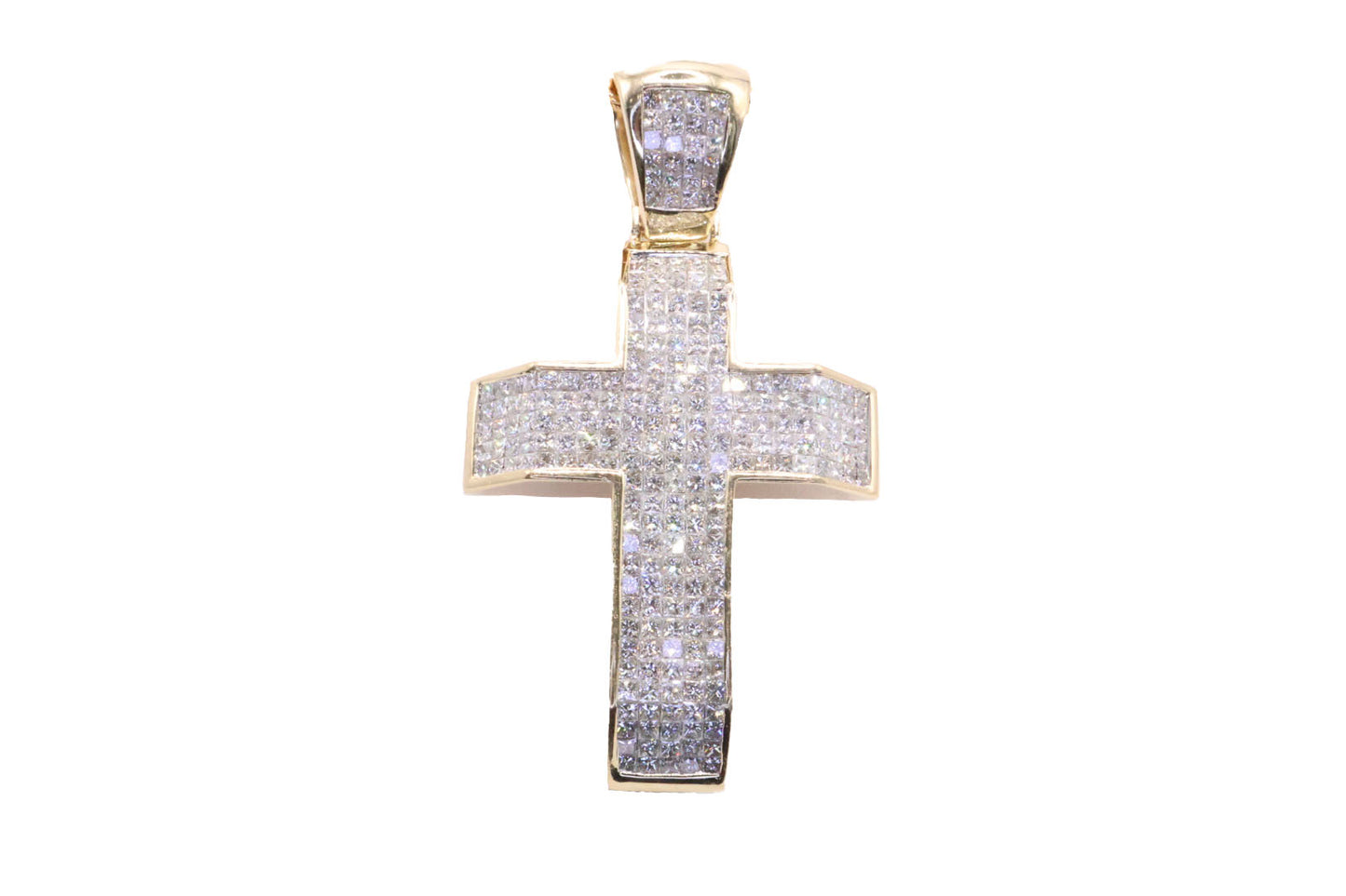 Crafted in stunning yellow gold, this Yellow Gold Cross with Princess Cut Diamonds features a striking cross design adorned with dazzling princess cut diamonds totaling 11.68 carats. A timeless symbol of faith, this exquisite piece adds elegance and sparkle to any outfit. Perfect for special occasions or everyday wear.