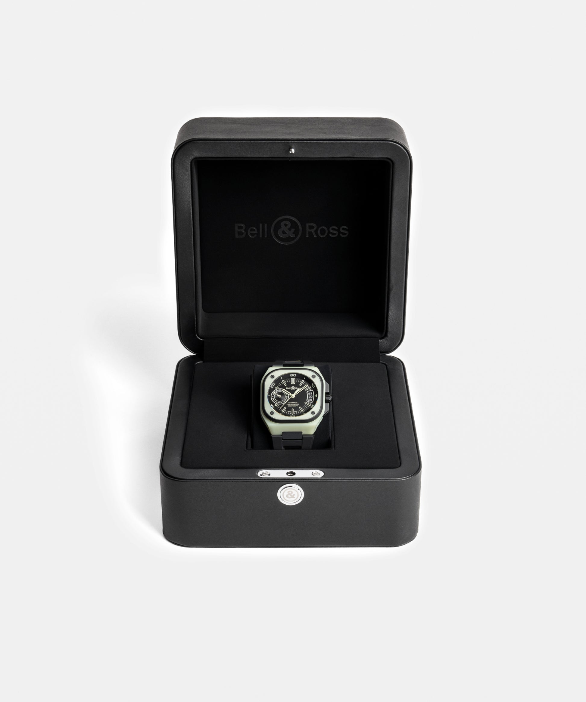 41 mm wide. 12.80 mm thick. Container in Grade 2 microblasted titanium with DLC (diamond-like carbon) finish. Upper and lower inserts in green luminescent fiberglass composite. Fixed bezel in Grade 2 microblasted titanium with bezel insert in luminescent composite. Screw-down crown and crown guard in Grade 2 titanium. Case-back in Grade 2 microblasted titanium with smoked grey sapphire crystal with anti-reflective coating. Case-back with oscillating weight.