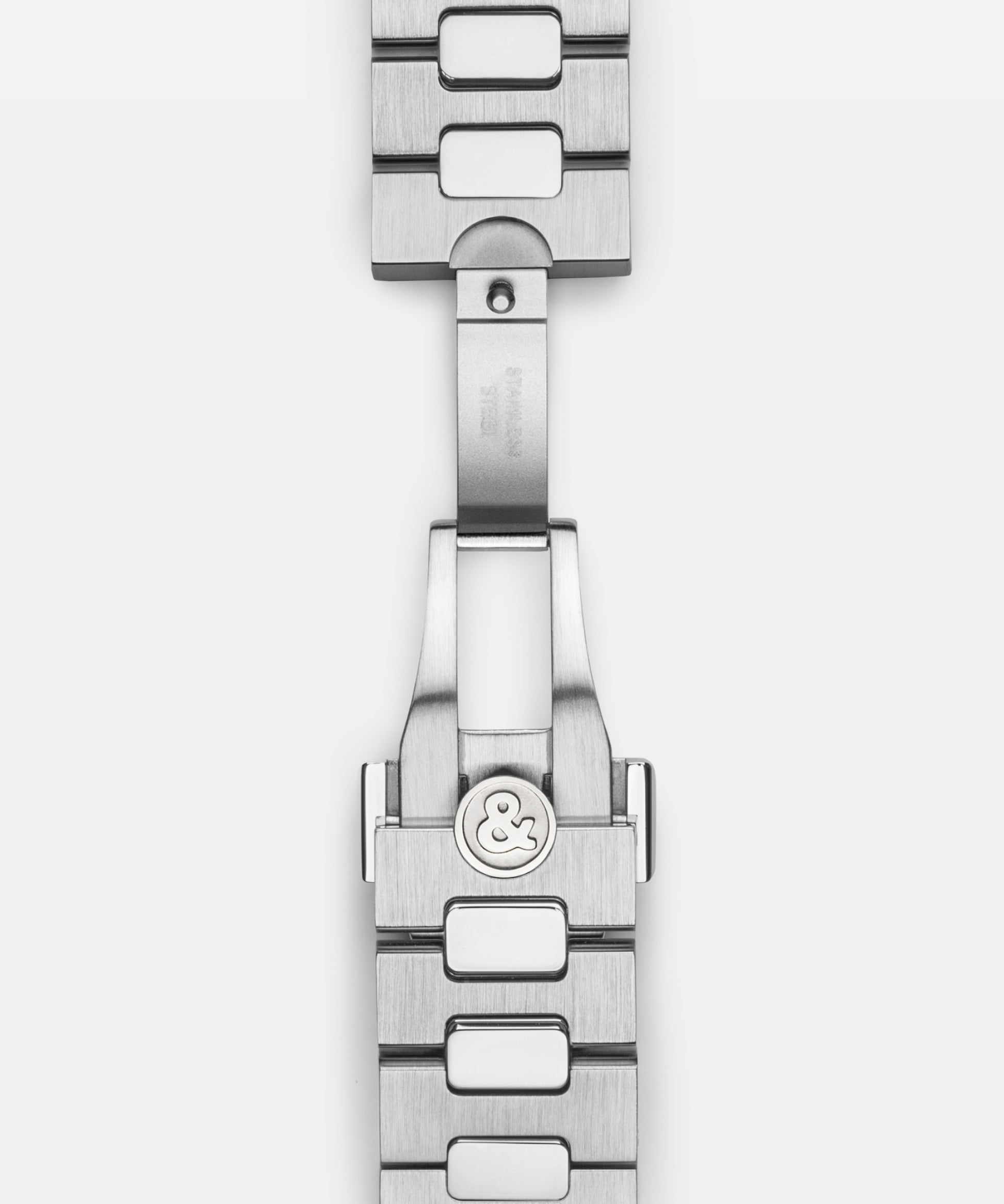 40 mm in width. Satin-polished steel. Screw-down crown. Sapphire case-back with a 360° oscillating weight.