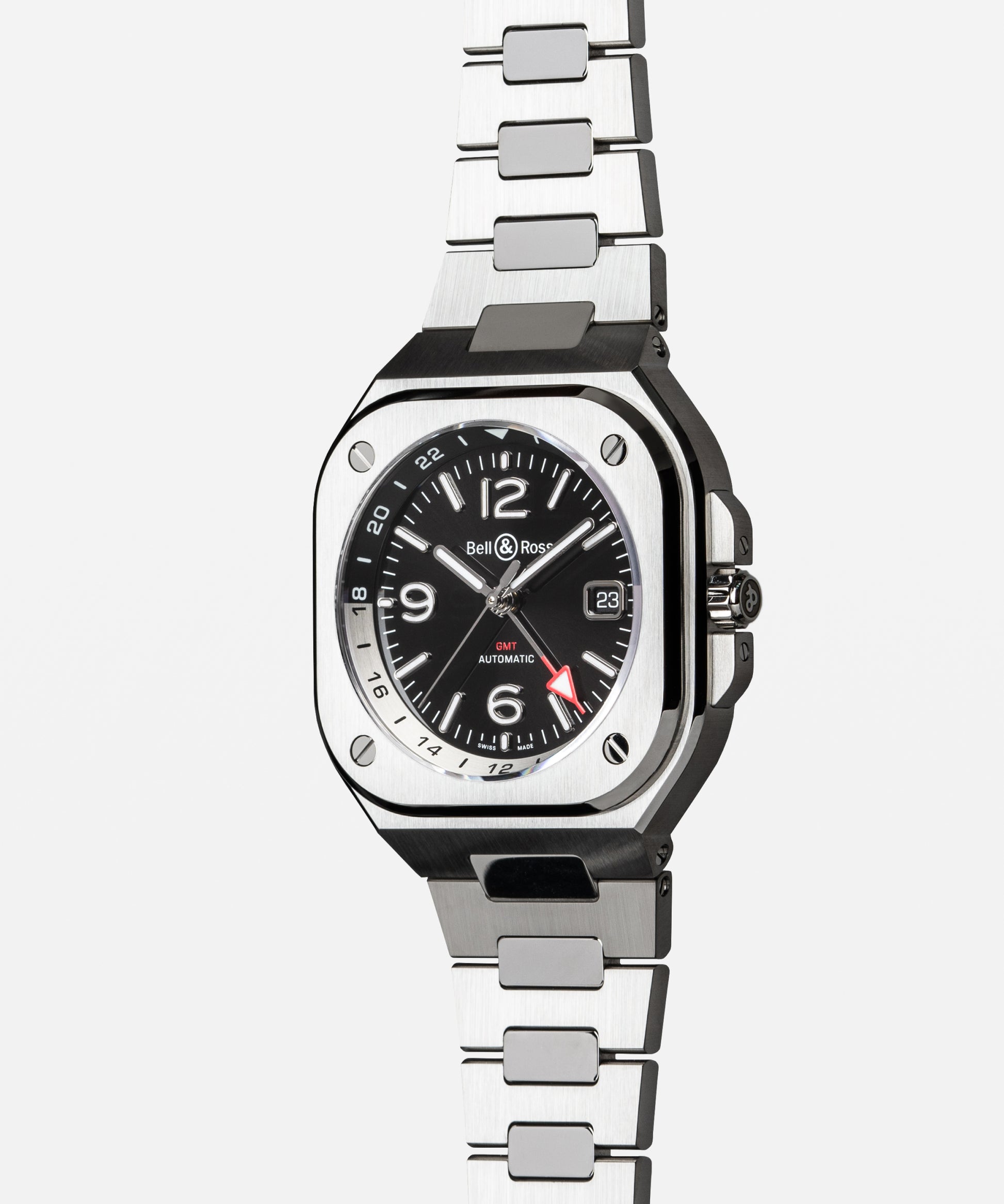 41 mm in width. Satin-finished and polished steel. White and black two-colour flange, with 24-hour scale. Screw-down crown. Crown guard. Sapphire case-back with 360° oscillating weight.