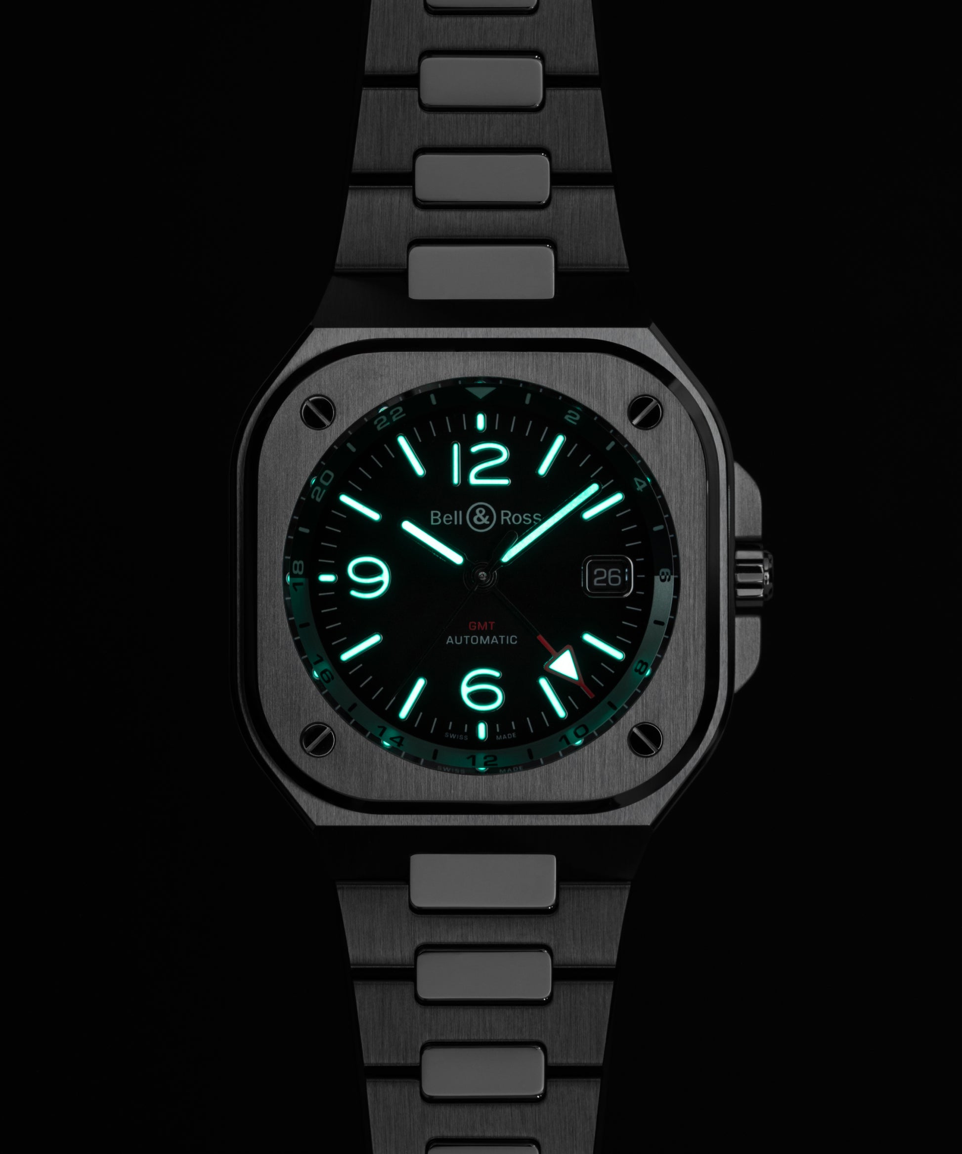 Hours, minutes, central seconds, second 24-hour time zone and date. Quick setting of the GMT hand, independently of the hour hand.