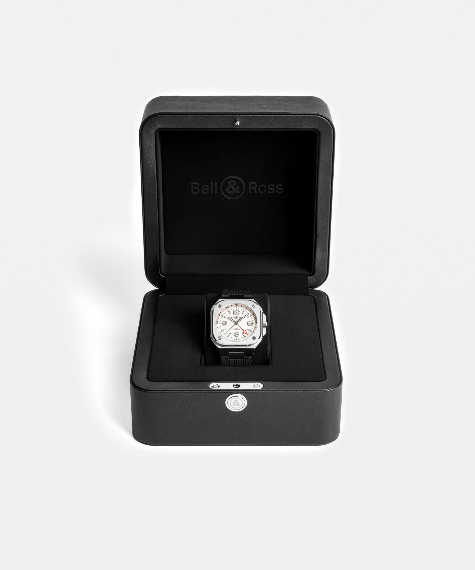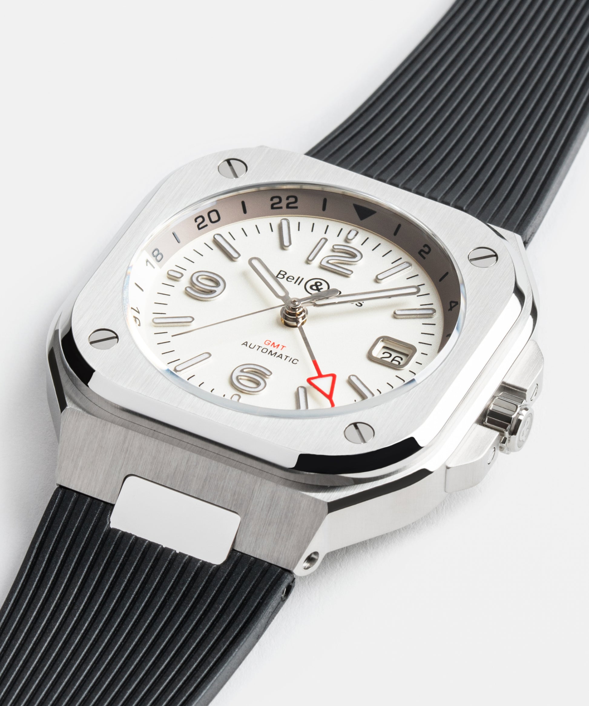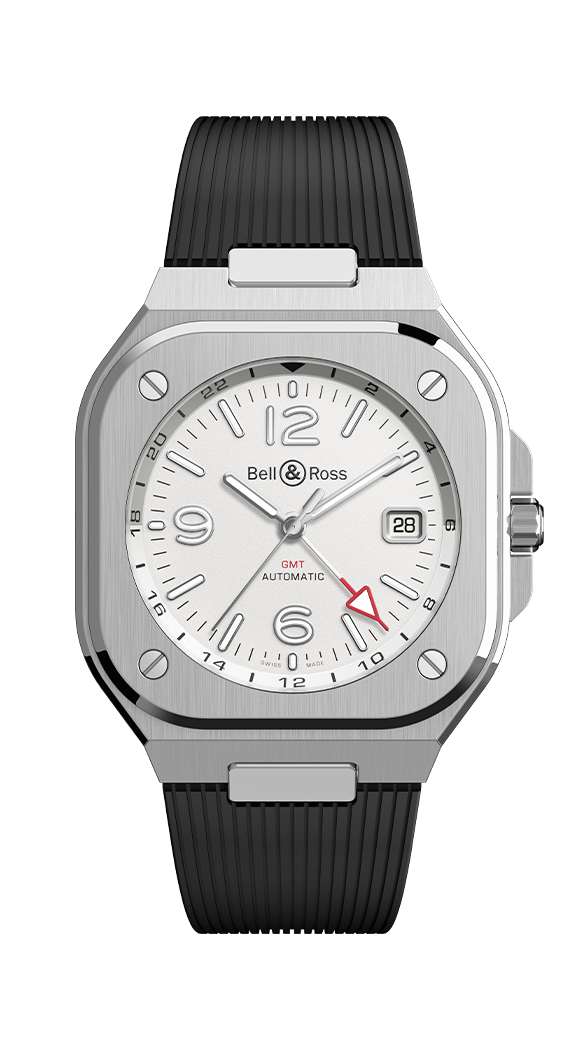 Silver opaline. Numerals and indices coated in Super- LumiNova®. Metal skeletonised Super-LumiNova®-filled hour and minute hands. GMT hand with red Super-LumiNova®-filled skeletonised triangular point.