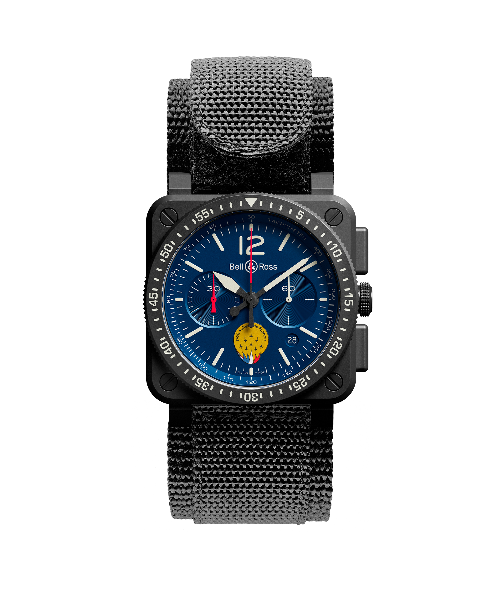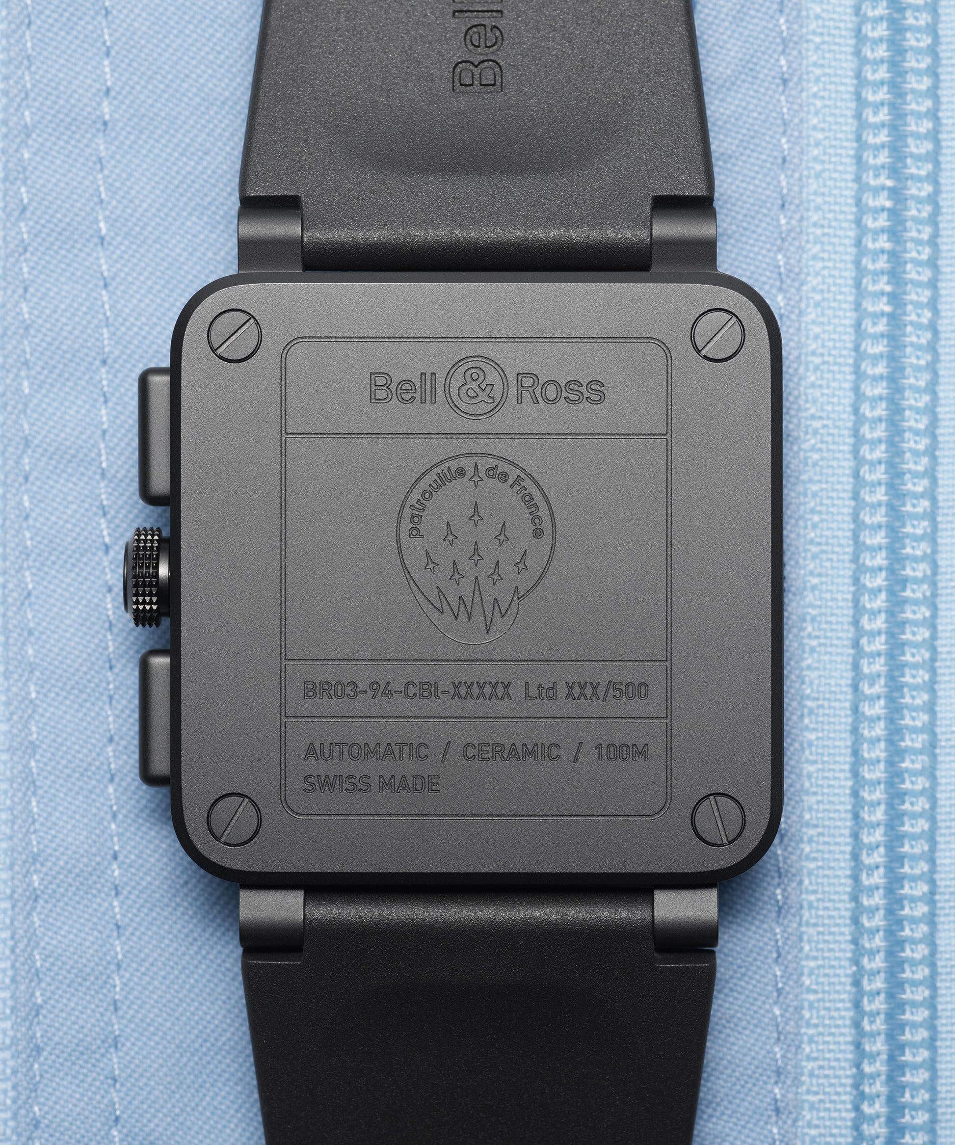 Blue. Patrouille de France logo at 6 o'clock. Numerals and indices painted in Super-LumiNova®. Metal skeletonised Super-LumiNova®-filled hour and minute hands.
