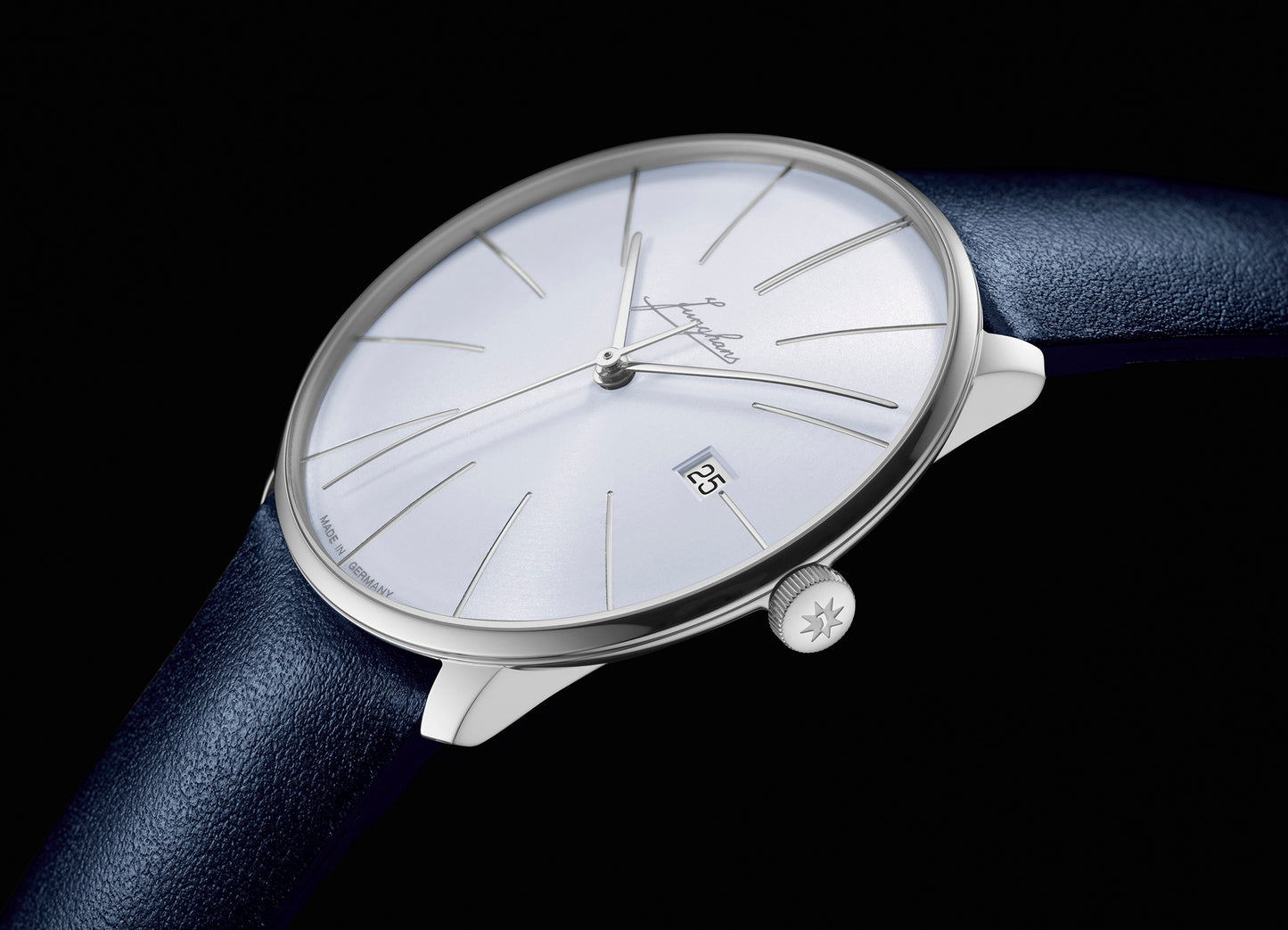 light blue with sunray brush, domed, diamond-effect hour markers, historical Junghans logo