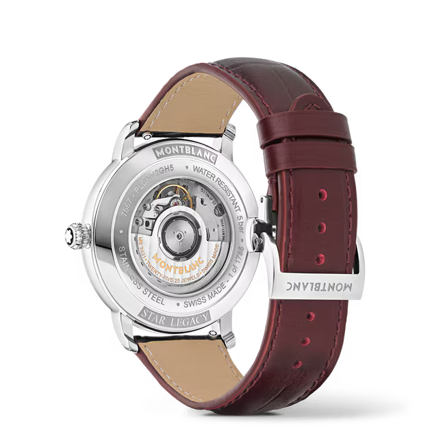 The Montblanc Star Legacy Moonphase Limited Edition of 1786 pieces pays tribute to the intrepid Jacques Balmat who was the first to reach the summit of the Mont Blanc in 1786. The timepiece presents a burgundy tone glacier patterned dial with a sfumato effect around the outside, a filet sauté, rose gold-coated hands and numerals, and Montblanc emblem on the counterweight of the seconds hand. This highly appreciated moon phase complication displays the phases of the moon at six o’clock with an elegant rose-gold-coated moon and stars on a blue background that are surrounded by a round date indicator. This model is powered by the MB 24.31 automatic movement and is housed in a 42 mm stainless steel case with an open case back on the movement. The timepiece comes with an interchangeable calf leather strap with an alligator print and vertical sfumato.