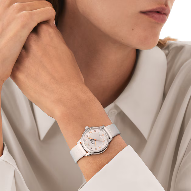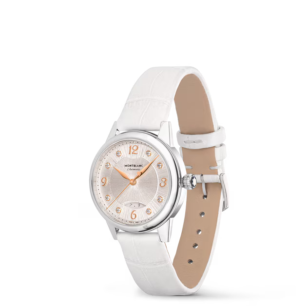 Interpreting the codes of fine watchmaking in an elegant and feminine way, the Montblanc Bohème Automatic Date is inspired by the world of handwriting and comes in a 30 mm stainless steel case. It features an elegant sunbrushed silver-white dial adorned with diamond indexes, rose gold-coated floral Arabic numerals and hands. Other refined details include a filet sauté pattern and a stamping technique called filé d’étoiles. Fitted with the automatic calibre MB 24.29, this model indicates the hours, minutes and seconds, as well as the date displayed in an almond-shaped aperture with handwritten numerals. The romantic font has also been applied to the dial for the mention “Automatic”. This timepiece is fitted with an interchangeable white calf leather strap with alligator print and an additional strap.