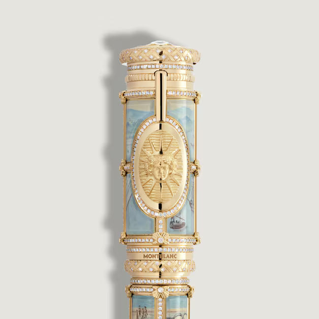 Versailles and King Louis XIV – inextricably linked to this day. The king’s taste for the magnificent manifests itself not only in the sheer scale of the palace and its glorious gardens, but above all in the 2300 rooms of the royal residence. The elaborate furnishings and decorations, made from the finest materials, are the epitome of regal style and splendour. The Palace of Versailles is more than a building; it is a complete work of baroque art in which architecture, garden design and arts and crafts harmonise to perfection. Louis XIV dreamed of transforming his father’s former hunting lodge into both a monumental residence and the focus of political power and cultural activity in France. With the A Journey through Château de Versailles Collection Montblanc takes a tour through this baroque masterpiece in celebration of the Versailles world heritage site. With the stunning A Journey through Château de Versailles Limited Edition 3, the master artisans at Montblanc evoke a sense of nostalgia through their extraordinary craftsmanship. Bringing the magic of the château to life, the edition draws the gaze from the spectacular Hall of Mirrors to its enchanting garden. The jewellery artists have transposed the majesty radiating from the heart of the palace onto this Limited Edition 3 by skilfully applying faceted enamel inlays to enhance cap and barrel of the solid Au 750 gold writing instrument. These breathtakingly fine miniature paintings depict the view of the gardens as reflected in the hall’s spectacular mirrors, seemingly immersing the beholder in the historical ambience of the 17th century. Each inlay is framed with gold strips, artfully hand-set with diamonds and delicate blossoms, echoing the characteristic Versailles aesthetic. In honour of Louis XIV, the ‘Sun King’, the sun takes centre stage in this edition: the artfully crafted clip ends in an elaborate diamond-encrusted medallion showing an image of the original sun king, Apollo. The opulent chandeliers of the Hall of Mirrors, in which the intricate tiers of crystals reflect the light in such spectacular fashion, are beautifully captured on the hand-crafted solid Au 750 gold nib, complemented by a brilliant-cut diamond. Marble decorations often found in the château inspired the engraving on the solid gold forepart. Louis XIV’s personal seal, the majestic double L monogram composed of two intertwined mirrored letters, also found its way onto this edition: the diamond-studded solid Au 750 gold cone takes the form of a seal stamp and as such can also be used to seal private correspondence. This skilled artwork is further refined with a pattern inspired by the design of the ornate parquet flooring in the palace. Borrowing its inspiration from the ‘Grand Chiffre’ system used at court for secret massages, the Limited Edition 3 has a similar air of mystery: it contains its own ‘chiffre’. Hidden in the cap top, a secret compartment opens to reveal the individually chosen engraving. Crowning the writing jewel is the Montblanc emblem set with diamonds in pavé, surrounded by a band of diamonds.