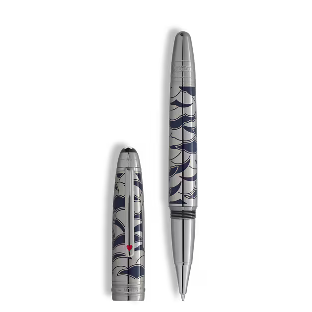 The Meisterstück Around the World in 80 Days collection draws its inspiration from Jules Verne's renowned adventure novel. The Solitaire LeGrand Rollerball, adorned in precious metal, recounts the epic journey of Mr. Fogg and Passepartout. Embarking on the final leg from Yokohama back to London via the United States, the duo traverses the vast American continent by train. Delve into the intricate details – a train elegantly lasered on the cap, a safety chain pattern on the cone, mirroring a pivotal moment when Passepartout detaches the train from the locomotive to save the crew who was attacked by Sioux. The cap's and barrel's design captures pressure valves and the billowing smoke of the locomotive, while the clip boasts a red lacquered heart card suit, symbolizing the union between Phileas Fogg and Princess Aouda. Additionally, card suits represent Fogg's daring wager to complete the journey in a mere 80 days. The cap top bears the embossed timeline of the journey – 36 days from Yokohama to London, culminating in the grand total of 80 days around the world.