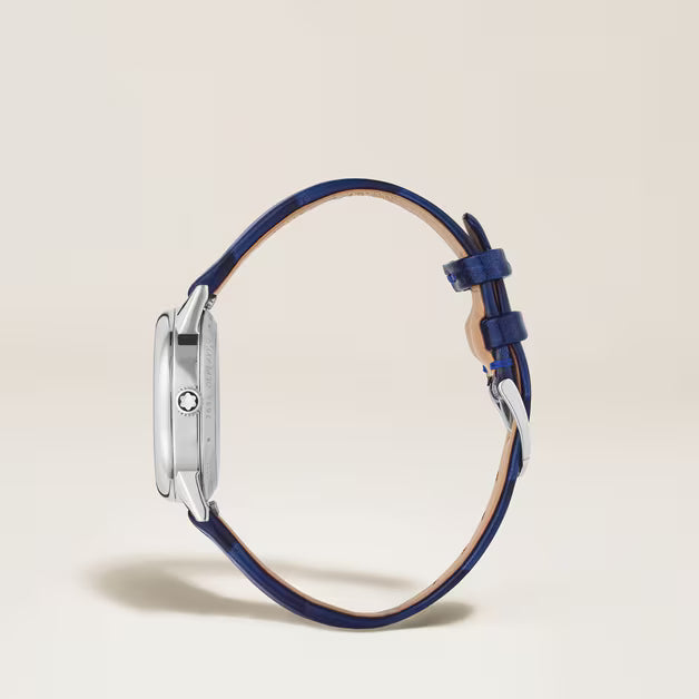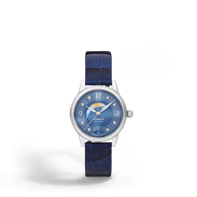 Interpreting the codes of fine watchmaking in an elegant and feminine way, the Montblanc Bohème Day & Night is inspired by the world of handwriting and watercolors and comes in a 30 mm stainless steel case. It features an elegant sunbrushed blue dial adorned with diamond indexes, rhodium-coated floral Arabic numerals and hands. Other refined details include a filet sauté pattern and a stamping technique called filé d’étoiles. Fitted with the automatic calibre MB 24.20, this model indicates the hours, minutes and seconds, as well as the date displayed in an almond-shaped aperture with handwritten numerals. The romantic font has also been applied to the dial for the day & night mention “Jour et Nuit”. The celestial day & night complication shows the changing sky over a period of 24h and brings a romantic and artistic touch to the timepiece as it is created with watercolors. This timepiece is fitted with an interchangeable blue calf leather strap with alligator print and an additional strap.