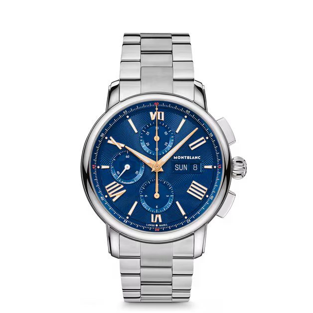 The Montblanc Star Legacy Chronograph Day & Date Limited Edition of 800 pieces takes its inspiration from Minerva pocket watches from the late 19th and early 20th century with their round, polished, pebble-shaped cases and onion-shaped crowns. Its beautiful blue dial features Montblanc’s signature exploding star pattern along with rose gold-coated sword-shaped hands and numerals. It is powered by the automatic movement MB 25.07 that includes a chronograph, the day of the week, and the date. This timepiece is also fitted with an interchangeable stainless steel bracelet.