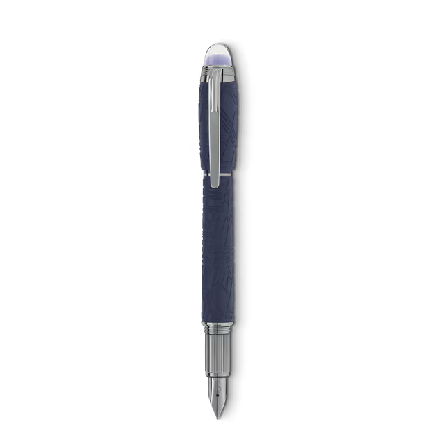 Starwalker Space Blue looks beyond planet Earth and turns towards the stars and the galaxy. This new Starwalker collection brings a new look to the resin cap and barrel, with a design that recalls the intricate structures of the Widmanstätten Pattern, one of nature's most hypnotic creations. All metal parts are coated in dark ruthenium, accompanied by a deep space blue tone for the matte precious resin, recalling the hues of a starry sky. In addition, the subdome on the cap top, over which the Montblanc emblem floats, comes in a deep space blue color. The fountain pen is hand-crafted with a ruthenium-coated Au 585 gold nib.